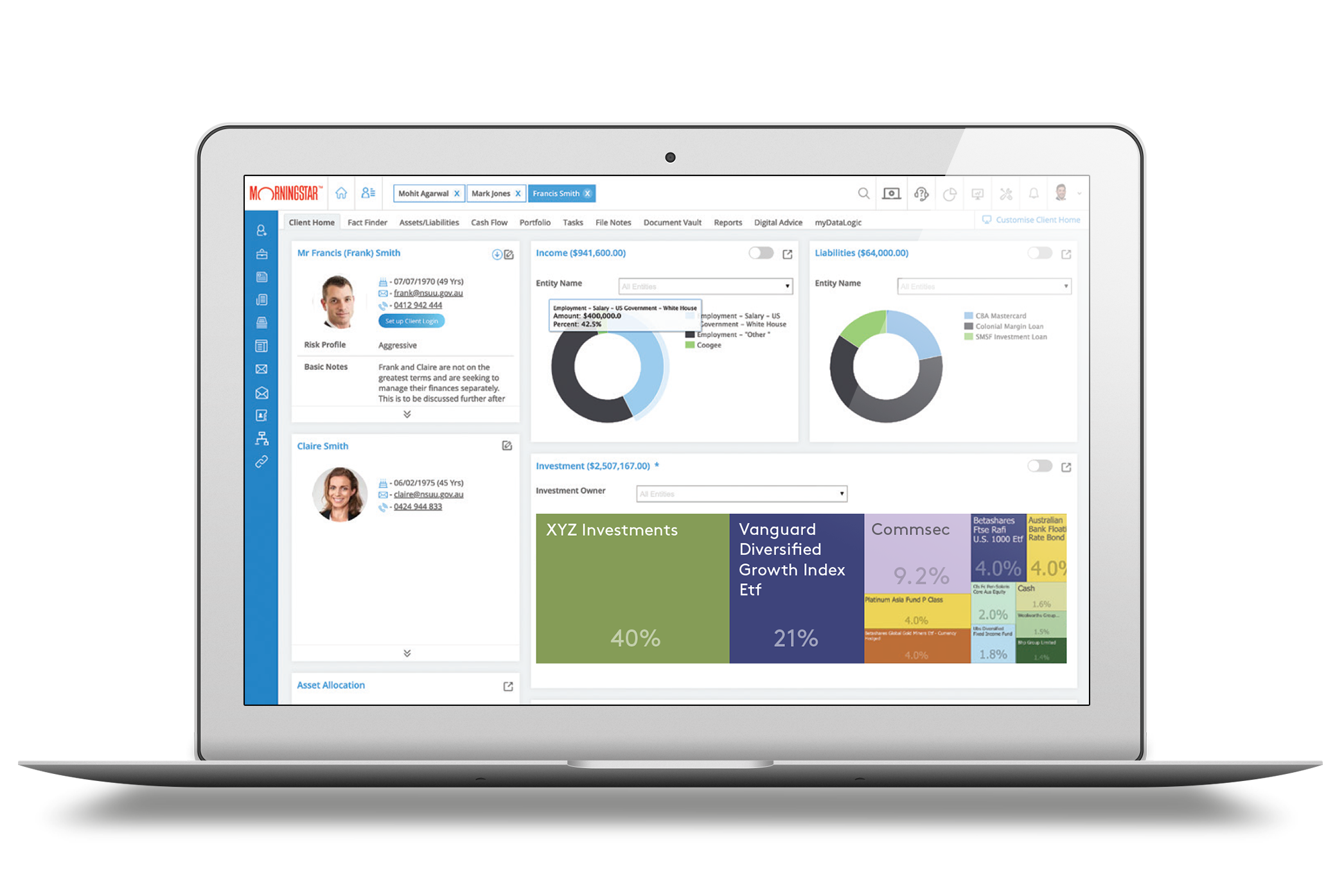Smart tools dramatically reduce the time needed to learn about your clients and think through their goals. Portfolio analytics help visualise trade-offs and find the best path forward.